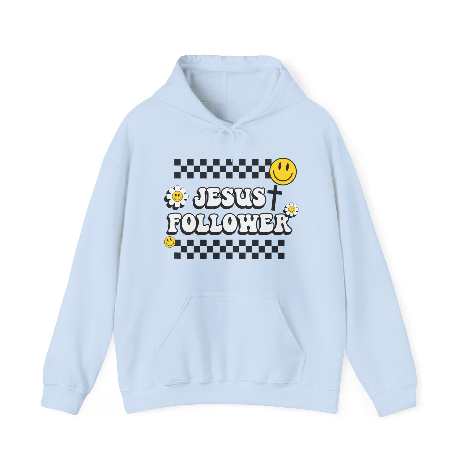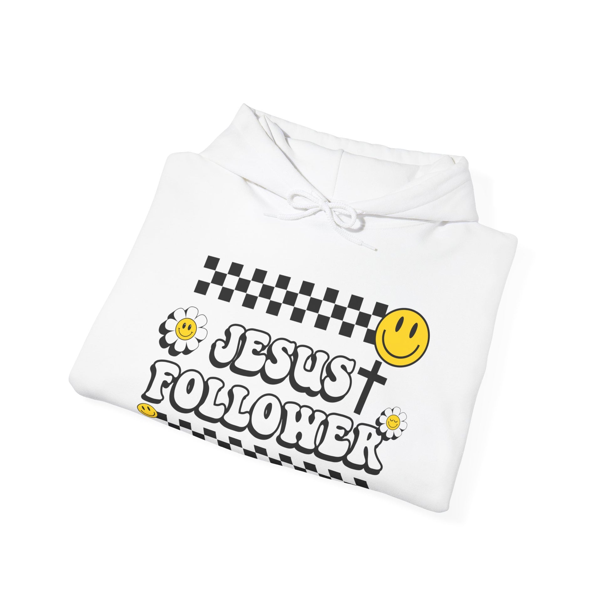 Jesus Follower Groovy Vibes Happy Face Hooded Sweatshirt - Christian Apparel, Retro Religious Clothing, Positive Graphic Hoodie
