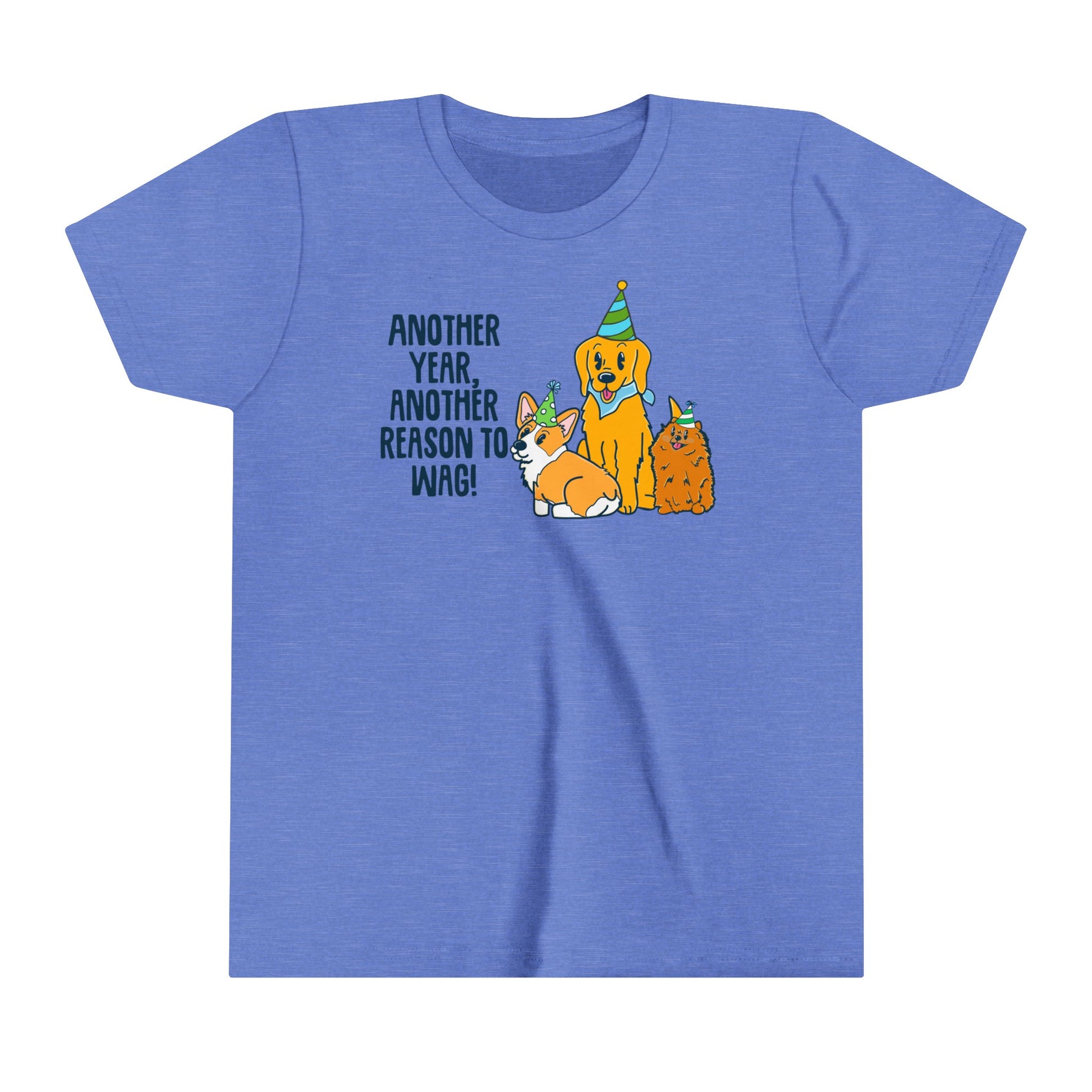 Kids will love this custom youth short-sleeved tee. This lightweight side-seamed shirt maximizes comfort all day long. The ring-spun cotton makes this kid's short-sleeved tee perfect for displaying custom artwork. Side seams keep the garment's shape. The shoulders have tape for longer fitting. The collar is extra elastic due to ribbed knitting. Introducing our delightful "Kids Birthday Tee with Dogs" – a perfect blend of style, comfort, and canine charm! This adorable shirt features the whimsical phrase "Another Year, Another Reason to Wag," celebrating the joy of birthdays and the love of our furry friends. - Key Features - .: Crafted from extra lightweight, airlume-combed, ring-spun cotton for unparalleled comfort and softness .: Retail fit ensures a perfect, comfy fit for your little one in any situation .: Crew neckline offers a modern, clean-cut style that's versatile and stylish .: Tear-away label for a scratch-free wearing experience .: Bella+Canvas products are part of the Fair Labor Association and Platinum WRAP certified, ensuring ethical and sustainable manufacturing practices .: Fabric blends: Heather colors - 52% cotton, 48% polyester, Black heather - 90% cotton, 10% polyester Perfect for birthdays or everyday wear, our "Kids Birthday Tee with Dogs" is sure to become a favorite in your child's wardrobe. Let them showcase their love for dogs in style and comfort!