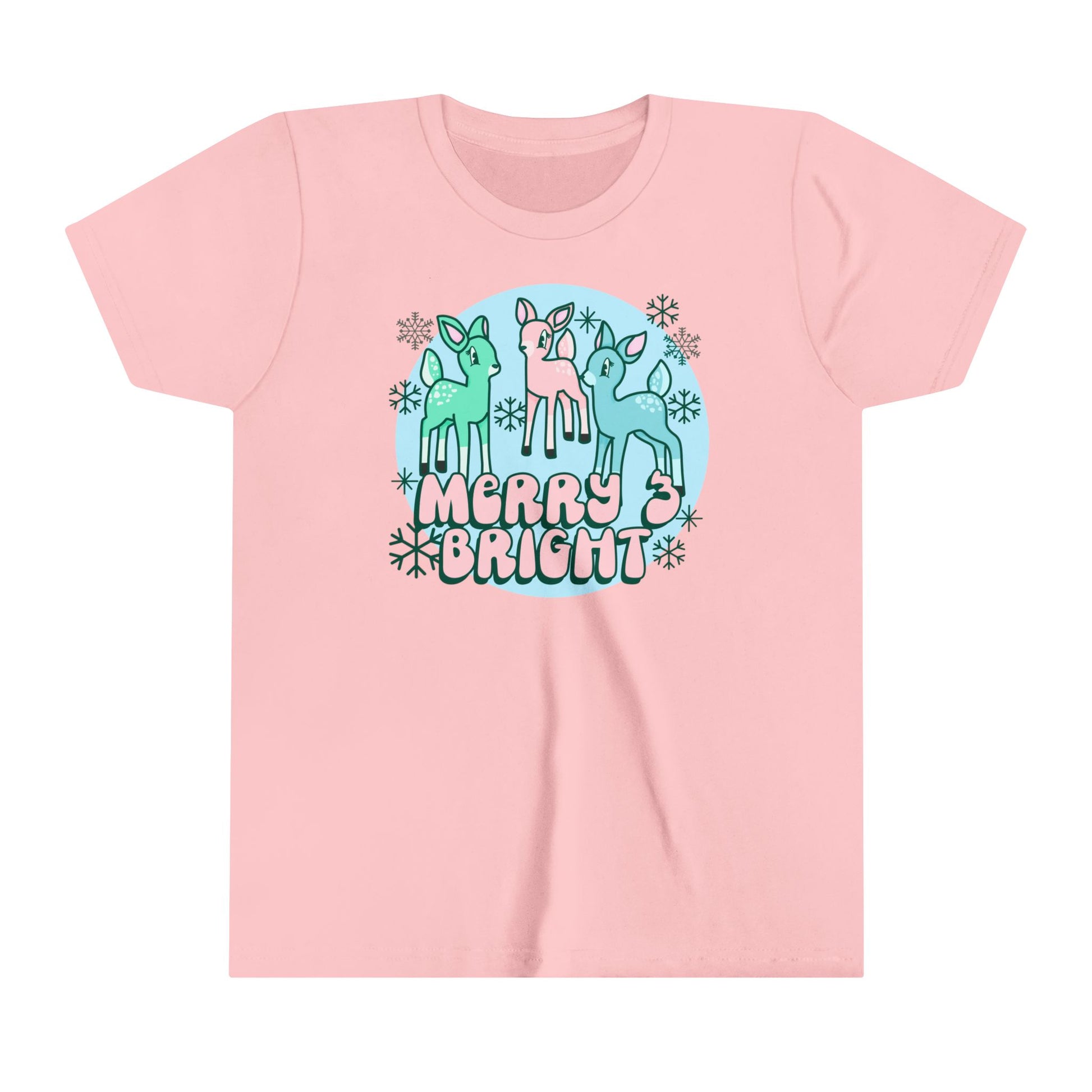 KIDS Merry and Bright Reindeer Pink Christmas Youth Size Shirt | Festive Holiday Apparel for Mom and Daughter | Christmas Girls Tee